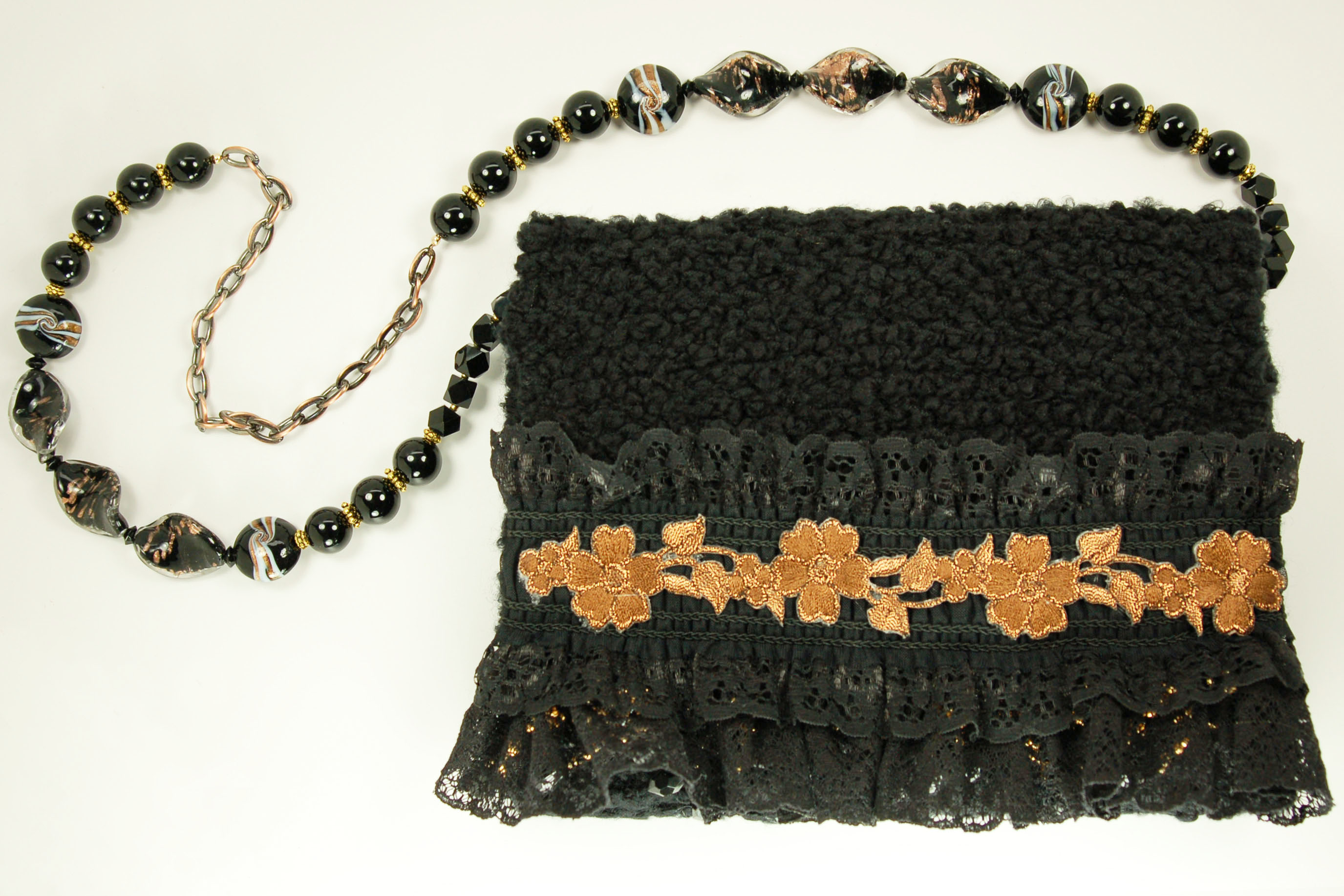 It is crafted of a highly textured, very soft black yarn. The embellishment on the top flap is trimmed in a row of black lace, topped with a wide black lace band that straddles a row of embroidered copper flowers and leaves. Below the row of black lace hang long gold and black beads.