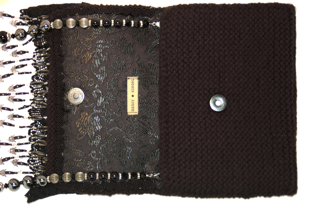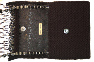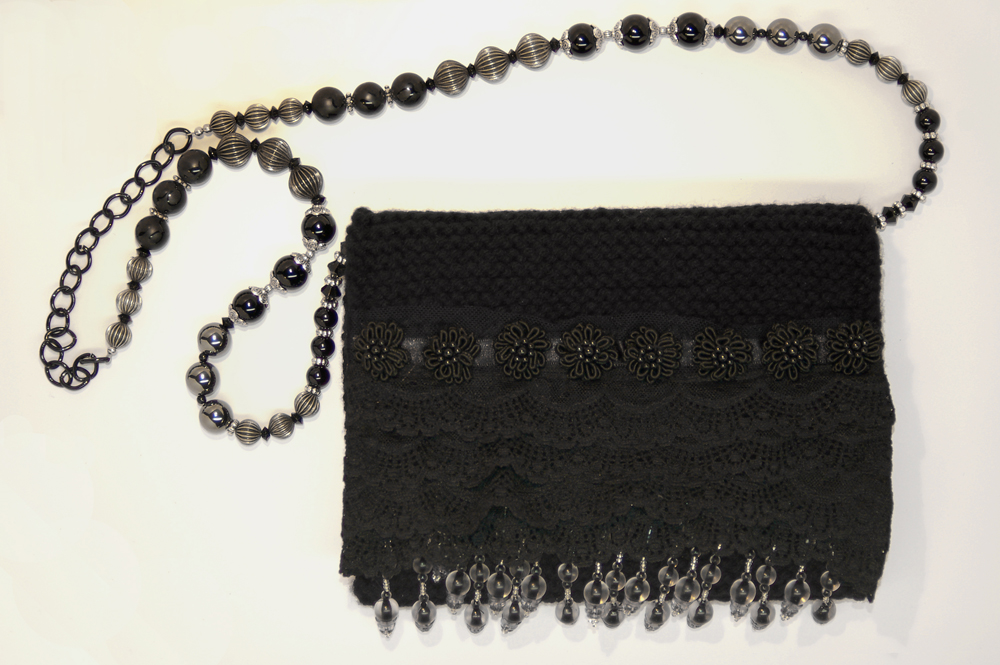 It is crafted of a soft black yarn. The embellishment on the top flap consists of four layers of soft black lace that are topped with black woven zinnia flowers with black beaded centers. Peaking out from below the lace are long hanging strands of black and translucent beads.