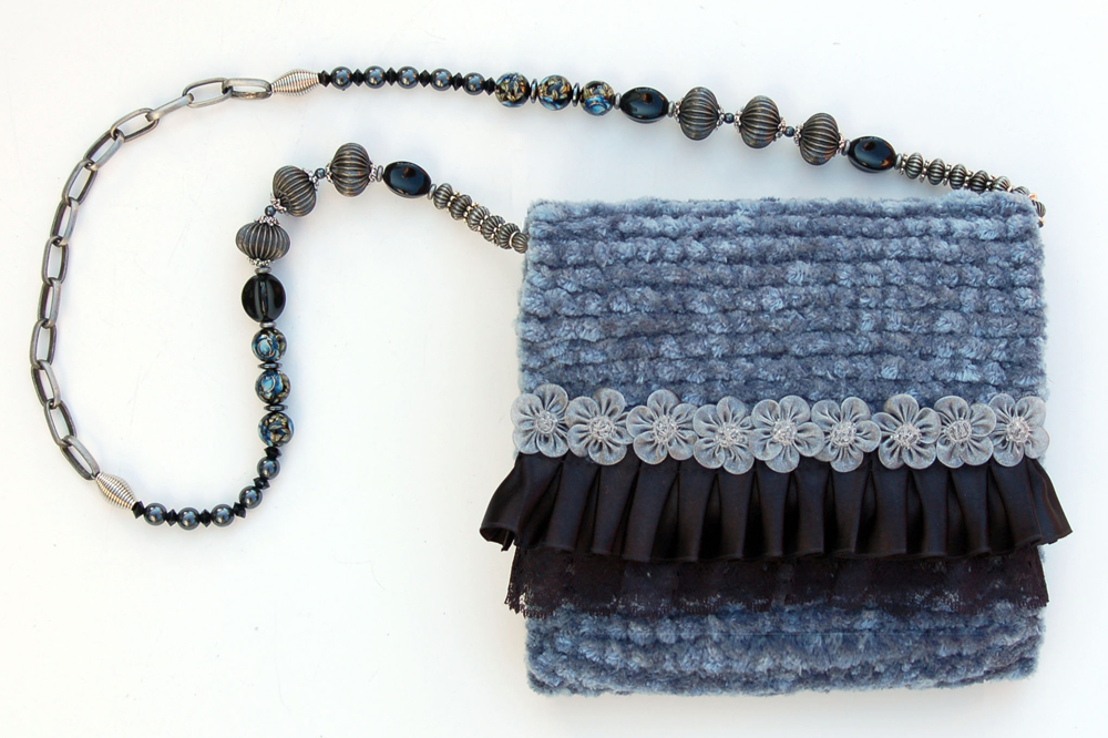 It is crafted of a soft medium tone blue chenille yarn. The embellishment on the top flap is constructed of a delicate black lace, which is topped with a soft black pleated ruffle and silver organza flowers which run the full width of the purse.