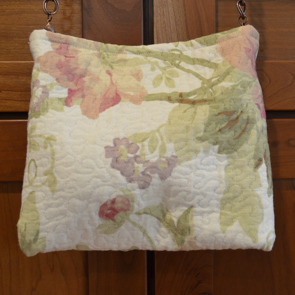 "Garden Party" measures 7 3/4"W x 7"H and is constructed both inside and out of woven cotton floral print in shades of rose, pink and green set upon an ivory background. The front of the bag is layered with soft ruffles in the same tones as the body and the inside of the bag. A woven trim in ivory brings out the neutral cream background in the cotton print. A removable deep copper chain drops the purse about 18" from the shoulder.