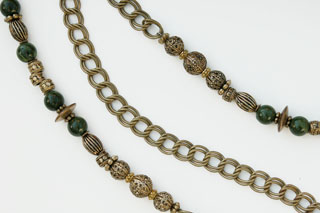 antique gold and jade colored beads. An antique gold-colored chain allows the purse to rest comfortably on the shoulder. In addition, the strap is removable, allowing the bag to be carried as a clutch.