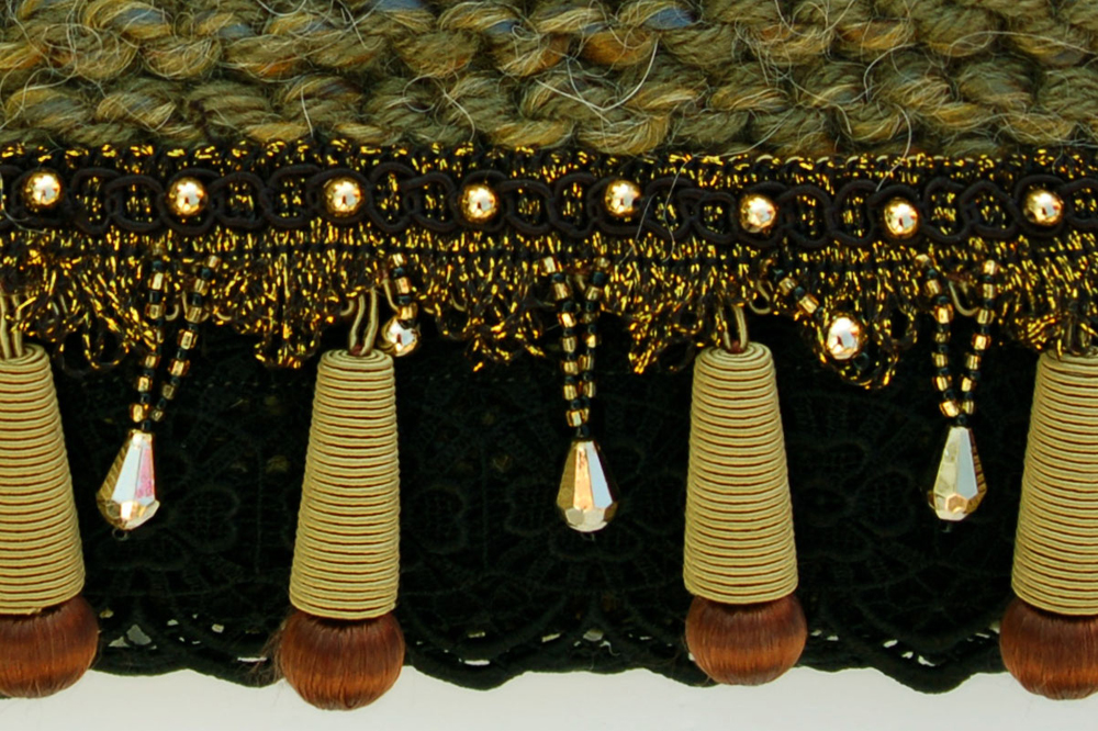 Golden Jade is one of the larger bags, measuring 9"W X 8"H. It is crafted of a textured jade colored yarn. The embellishment on the top flap is trimmed with a double row of open stitched black lace that is topped with hanging olive colored fabric beads. The addition of a beaded black and gold trim brings an exciting glitter to the appearance of the purse.