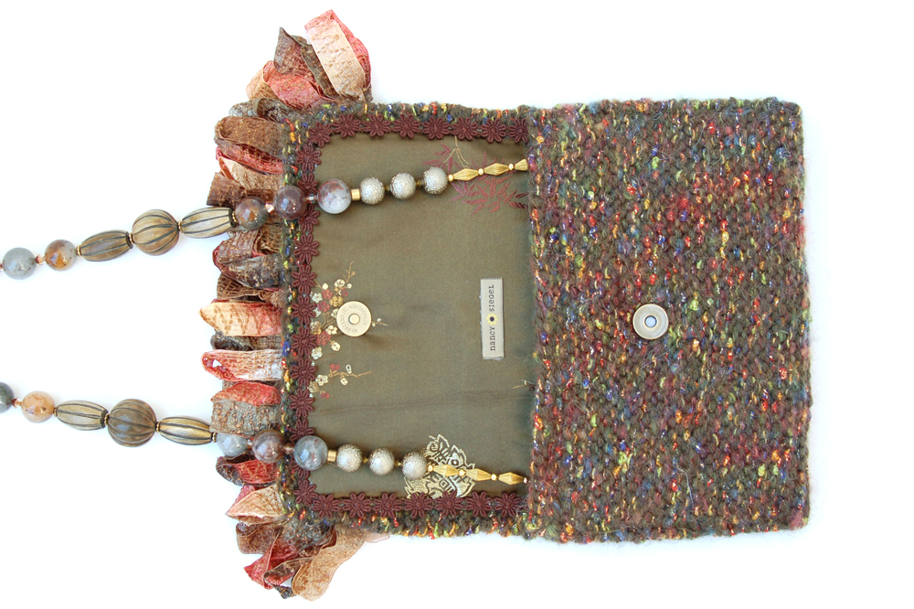 Jade Ruffle is one of the larger bags, measuring 8"W X 7"H. It is created with two yarns; a very soft forest green yarn in combination with a multi-colored jewel tone irridescent ribbon yarn. The embellishment on the top flap is trimmed with a multi-colored soft silky feminine ruffle. The ruffle is bordered by a row of soft peach organza rosettes.The interior of the bag is lined with a soft green fabric with accents of color that coordinate beautifully with the body of the purse.The strap is 34" long. It is designed with