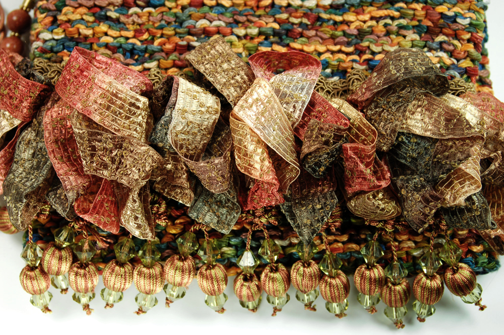Jeweled Sunset measures 7.75"W X 6."H. It is created with two yarns; a very soft multi-colored yarn in combination with multi-colored ribbon yarn. The embellishment on the top flap consists of a multi-colored soft silky feminine ruffle that is trimmed with a coordinating woven band. Hanging just below the ruffle is a row of translucent lime colored beads and woven beads.The interior of the bag is lined with a soft goldtone fabric that coordinates beautifully with the body of the purse.The strap is 34" long. It is designed with