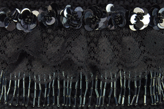 Metallic Night measures 6"W X 5.75"H. It is created with a black ribbon yarn. The embellishment on the top flap consists of a row of hanging black metallic tube beads that is topped with a beautiful black woven trim. Following is a double row of black lace ruffle. Finally, the top row consists of black sequin flowers.