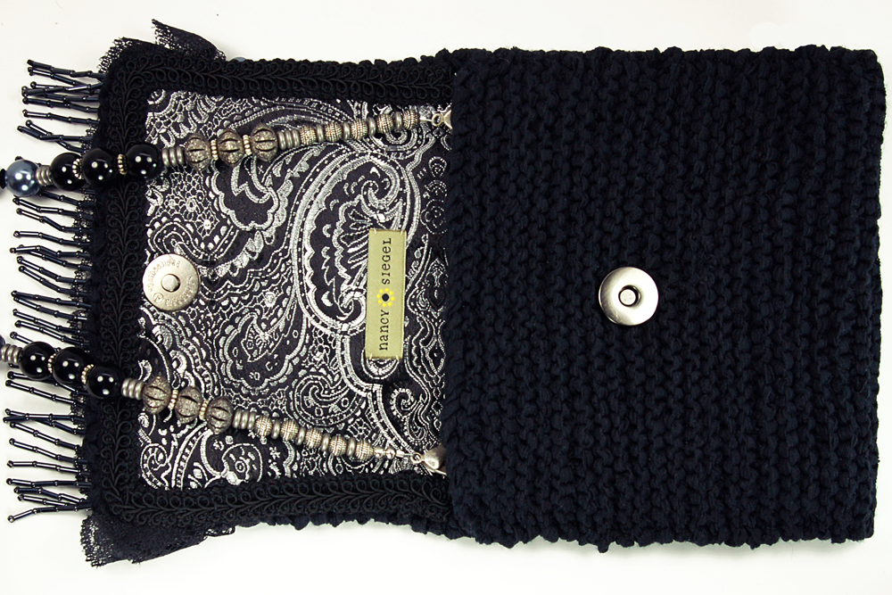 The interior of the bag is lined with a soft black and silver patterned fabric that coordinates beautifully with the body of the purse.