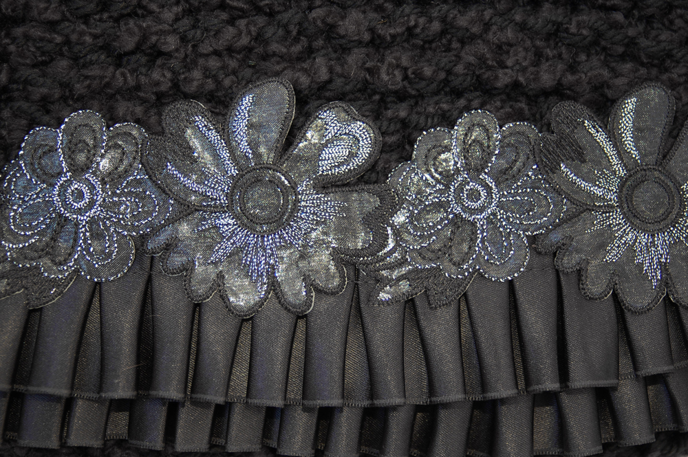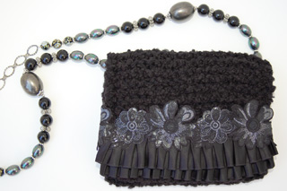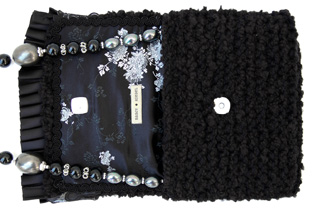 Midnight Flower measures 8"W X 7"H. It is created with a very soft nubby black yarn. The embellishment on the top flap is trimmed with a double row of black ruffle and topped with a black and silver floral applique.