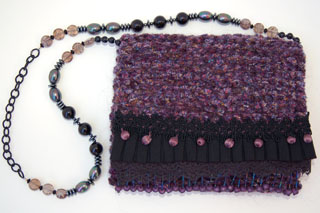 Mulberry Bauble measures 8.5"W X 8"H. In deep raspberry and black this purse is the perfect addition to a solid black outfit that asks for a beautifully rich color accent. It is created with a very soft purple chenille yarn that feels luscious to the touch. Scattered sparkles add a subtle brightness to this already gorgeous bag. The embellishment on the top flap consists of 5 different layers, starting with a row of deep, irridescent beads that dangle with a deep raspberry bead at the end. The following layer of black lace is perfectly topped with a pleated grosgrain ruffle. The addition of delicate fabric beads in deep raspberry are followed on top with a delicately feminine lace applique.The inside is lined with a perfectly selected patterned fabric that has a black background and accents of sage green and lavender.The strap is 32" long. It is comprised of a combination of black, hematite and rose glass beads. A black chain allows the purse to rest comfortably on the shoulder. In addition, the strap is removable, allowing the bag to be carried as a clutch. |