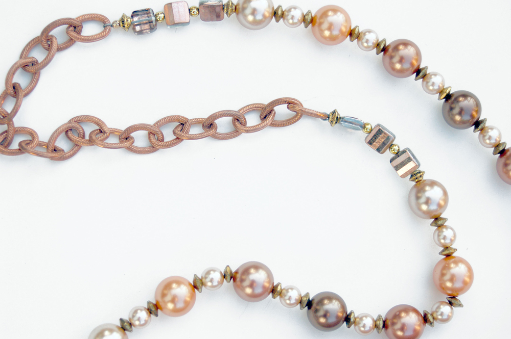 The strap is 31" long. It is comprised of pearls in various shades of peach, copper and ivory, along with accents of antique gold. A rose colored chain allows the purse to rest comfortably on the shoulder. In addition, the strap is removable, allowing the bag to be carried as a clutch.For additional information