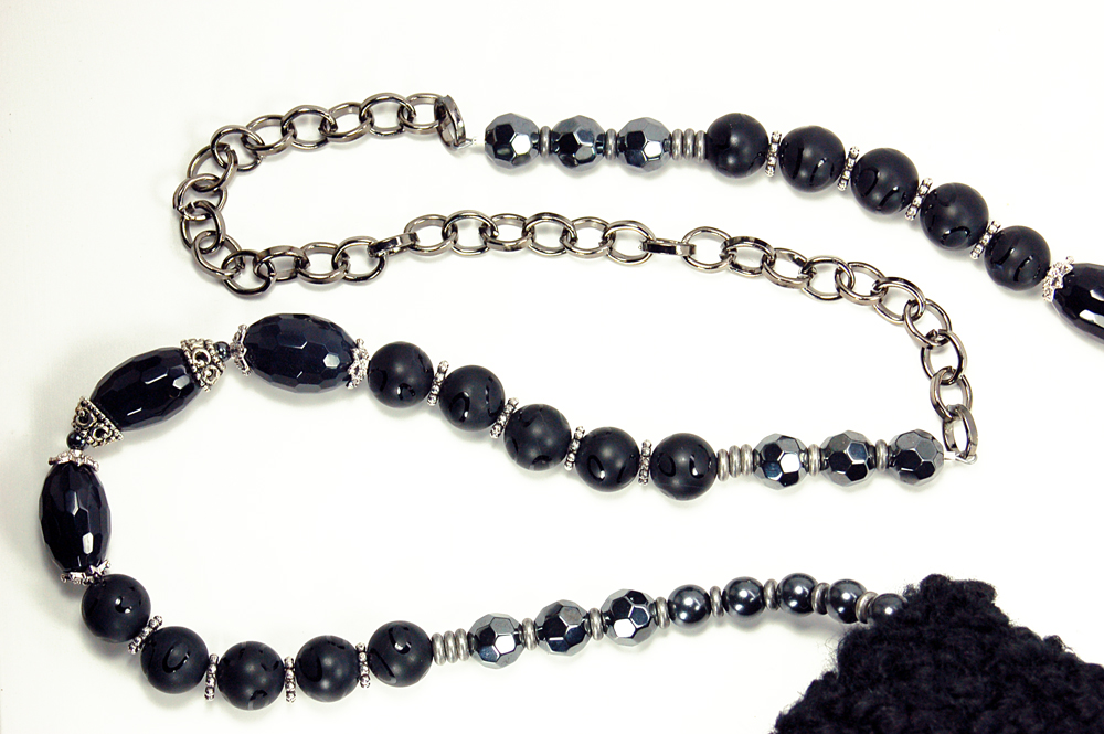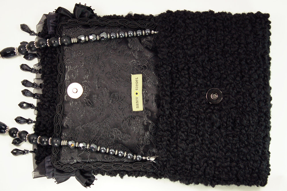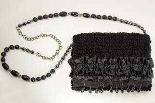 Ruffled Rose measures 7.5"W X 6"H. It is created with a very soft black textured yarn. The embellishment on the top flap consists of a row of hanging black tear drop beads that is topped with a black trim. Following is a double row of organza and satin ruffle. The top row is a puckered black satin ruffle, dotted with black satin rosettes.The interior of the bag is lined with a soft black on black patterned fabric that coordinates beautifully with the body of the purse.The strap is 38" long. It is designed with