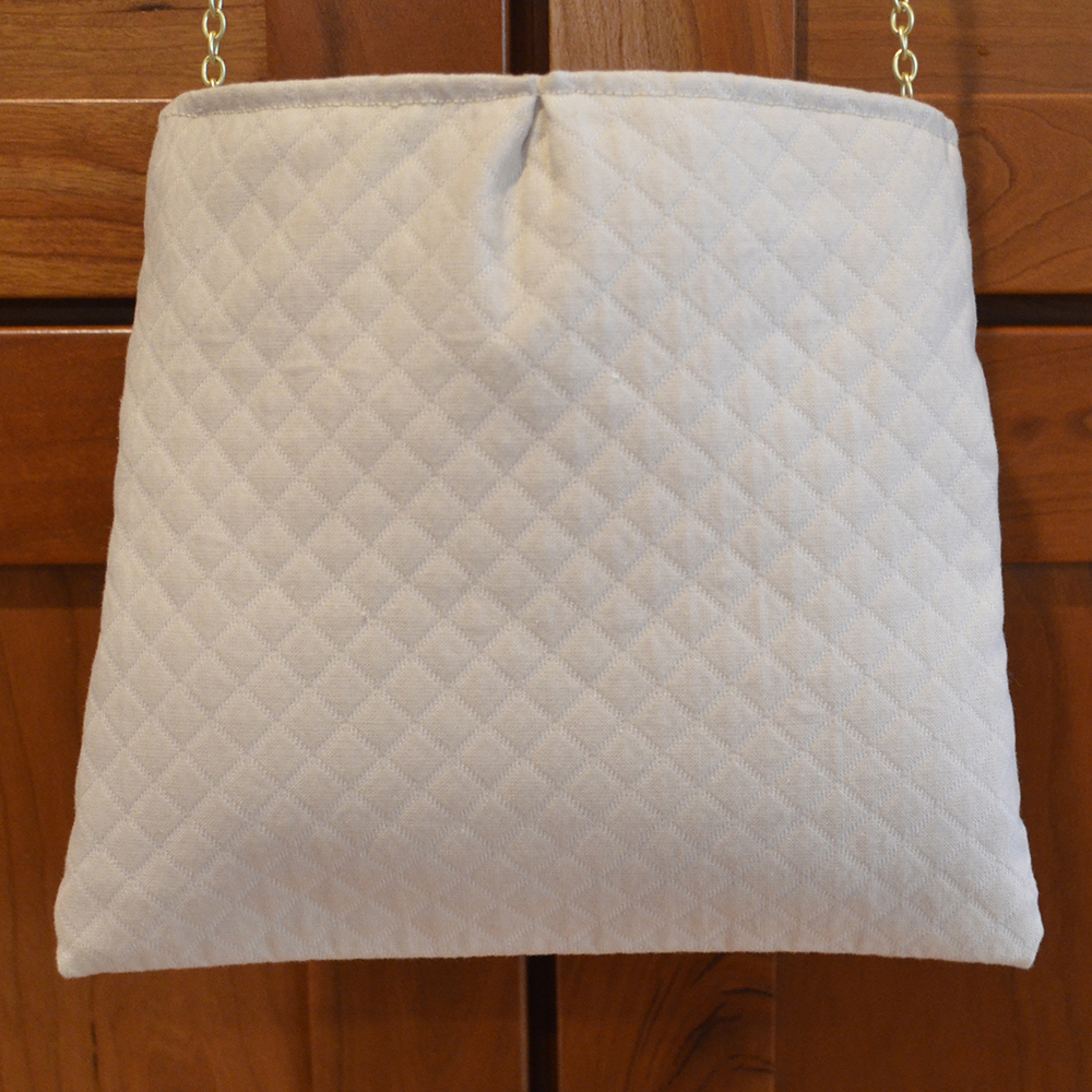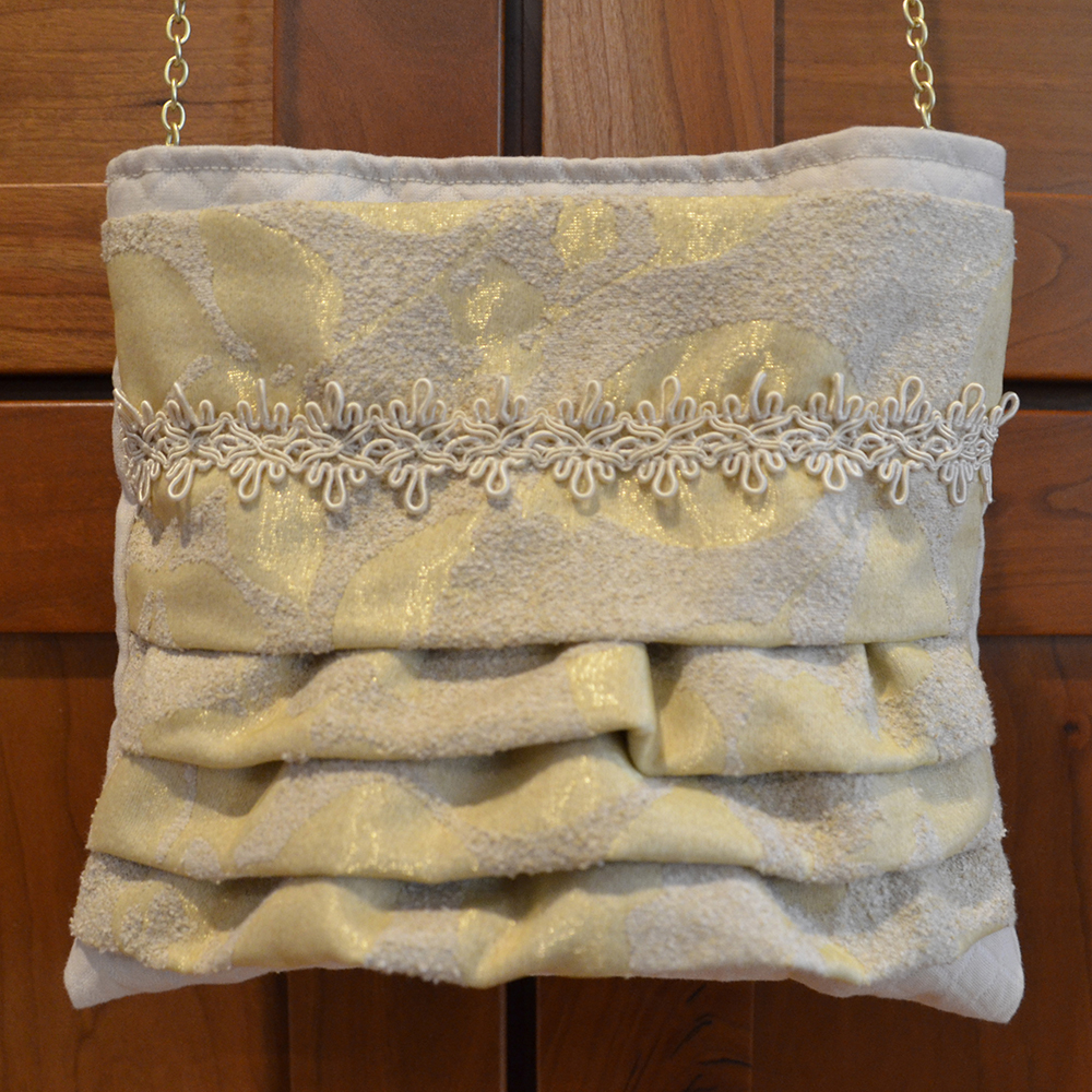 This purse is soft and feminine. The bag measures 8"W x 7 3/4"H. The body of the purse is a diamond patterned cream-colored cotton fabric and the lining is the same fabric. The front ruffle is a very pale yellow leaf pattern on a soft nubby textured fabric. There is a cream trim that spans the front width of the bag, just below the top. The bag has a 17 1/2" drop on a removable golden chain.For additional information