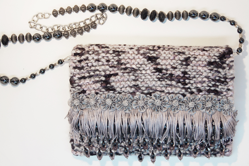 Silver Fringe measures 9"W X 6.5"H. It is created with two yarns; a very soft silvery grey colored yarn in combination with soft black and silver ribbon yarn. The embellishment on the top flap consists of a row of black and translucent hanging beads, topped with a double row of silver fringe that is bordered by ten silver organza daisies. Each daisy center is detailed with tiny translucent beads.