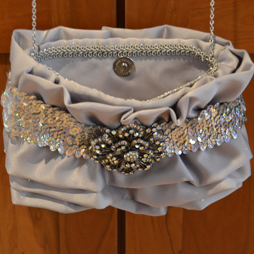 "Silver Sequin" measures 8"W x 5 1/2"H and is constructed both inside and out of a very pale grey satin fabric with subtle glitter within the fabric. The front of the bag is layered with soft ruffles in the same fabric as the body of the bag. A sequin band wraps around the whole bag, about one inch from the top. A rhinestone pin sits in the center of the band on the front of the bag. A removable silver chain drops the purse about 20" from the shoulder.For additional information about "Silver Sequin", please email me. I'd love to hear from you!