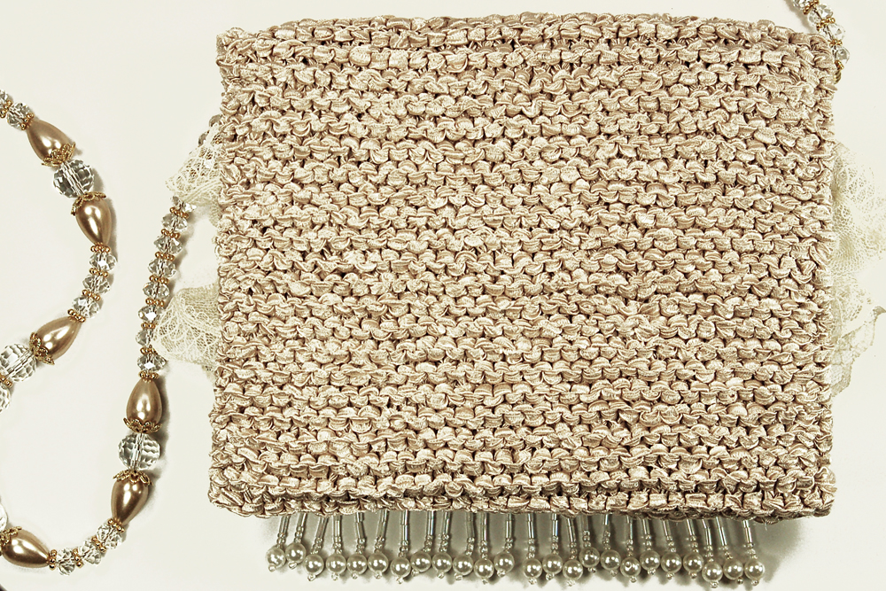 of a pale beige shimmering ribbon yarn. The flap is adorned with long strands of white pearlized beads and a row of very soft and feminine lace ruffle with a row of ivory woven flowers down the center of the ruffle.