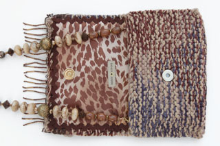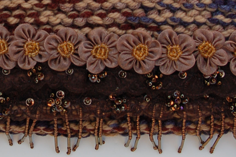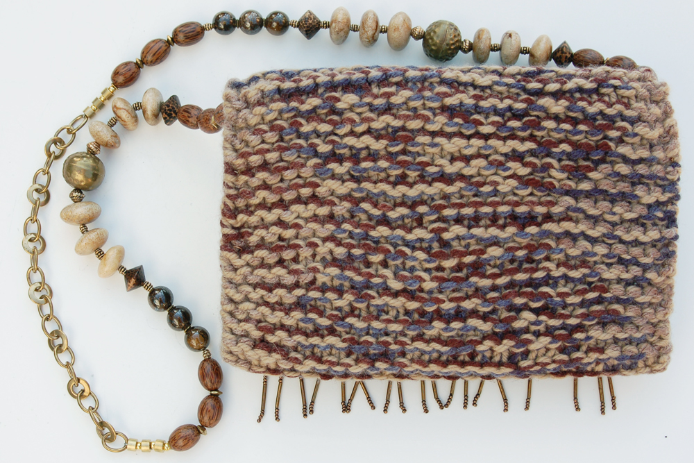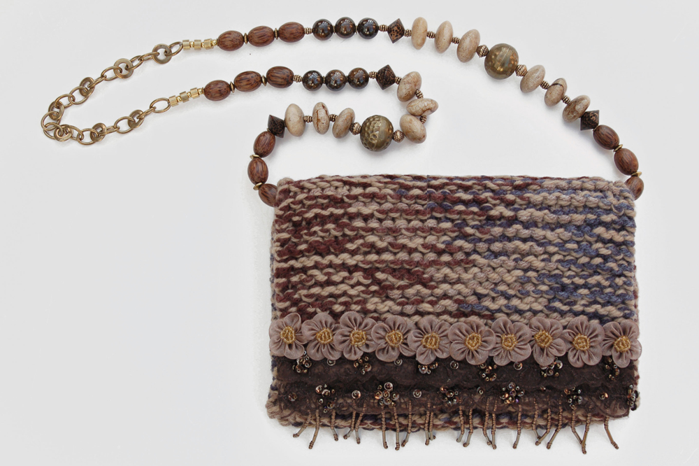 It is crafted of soft multi-colored yarn in brown, tan and smokey blue. The fringe on the top flap is constructed of brown beaded lace, with bronze colored hanging beads and topped with soft taupe organza flowers.