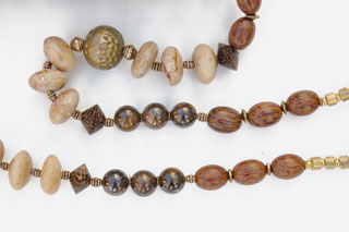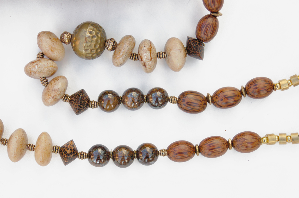 gold colored beads, as well as wood and stone beads. A gold colored chain at the top allows the purse to rest comfortably on the shoulder. In addition, the strap is