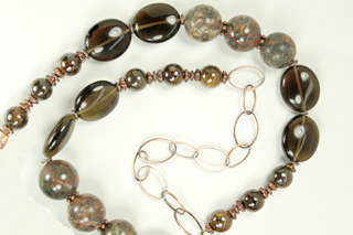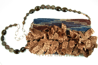 Cocoa Silk measures 8.75"W X 6"H. It is created with soft yarn in multiple tones of brown, blue and beige. The embellishment on the top flap consists of a layer of very soft brown silky ruffle that is topped with a flat brown satin trim. Hanging just below the ruffle is a row of long strands of bronze beads.The interior of the bag is lined with a soft brown and gold fabric that coordinates beautifully with the body of the purse.The strap is 34" long. It is designed with