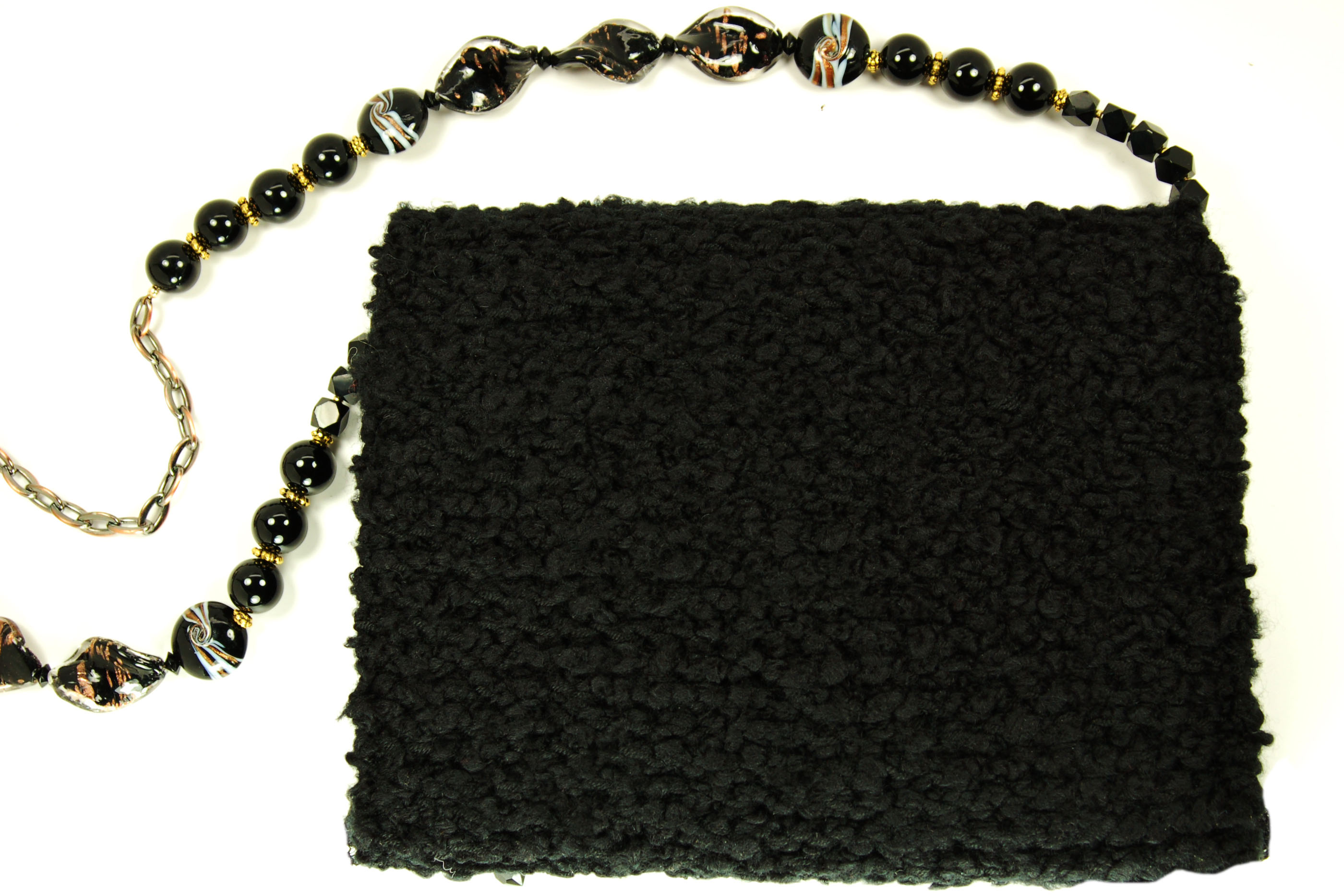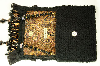 It is crafted of a highly textured, very soft black yarn. The embellishment on the top flap is trimmed in a row of black lace, topped with a wide black lace band that straddles a row of embroidered copper flowers and leaves. Below the row of black lace hang long gold and black beads.