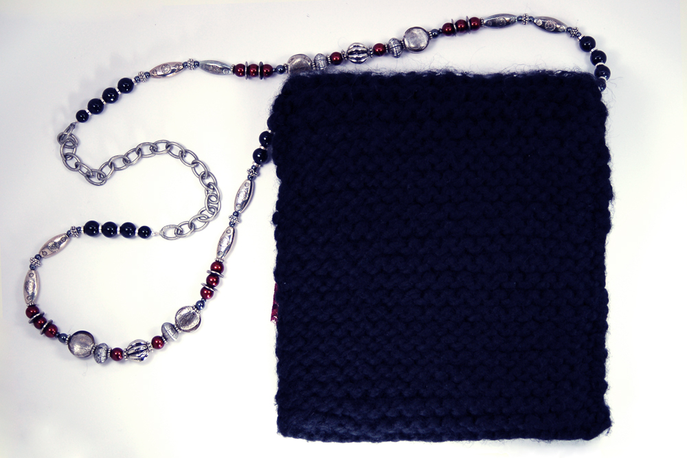 of various yarns. The body of the purse is knitted with a soft black yarn, while the top flap is made with an irridescent silver
