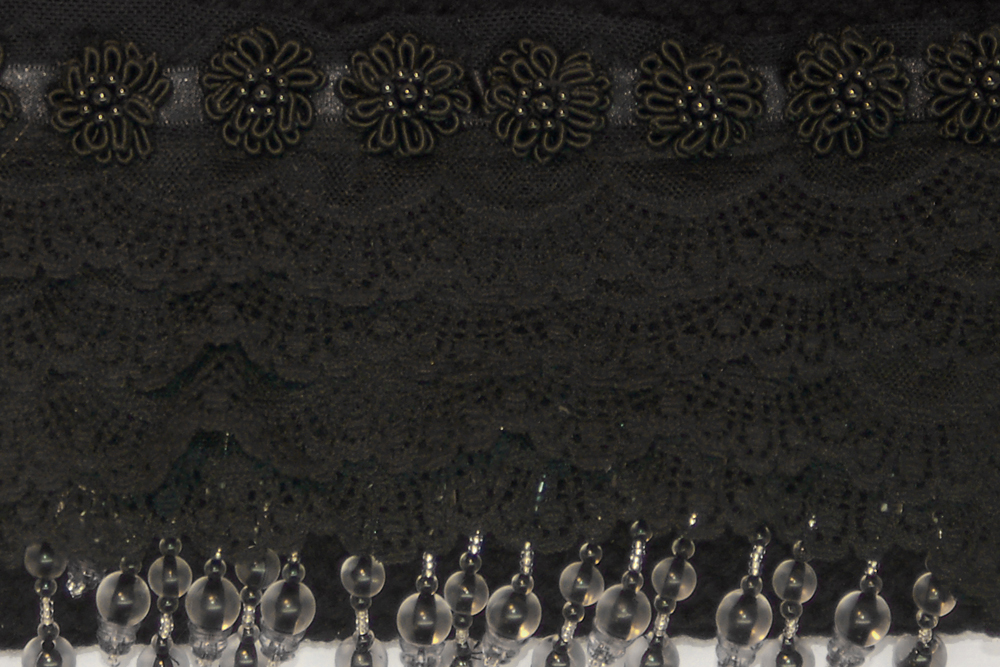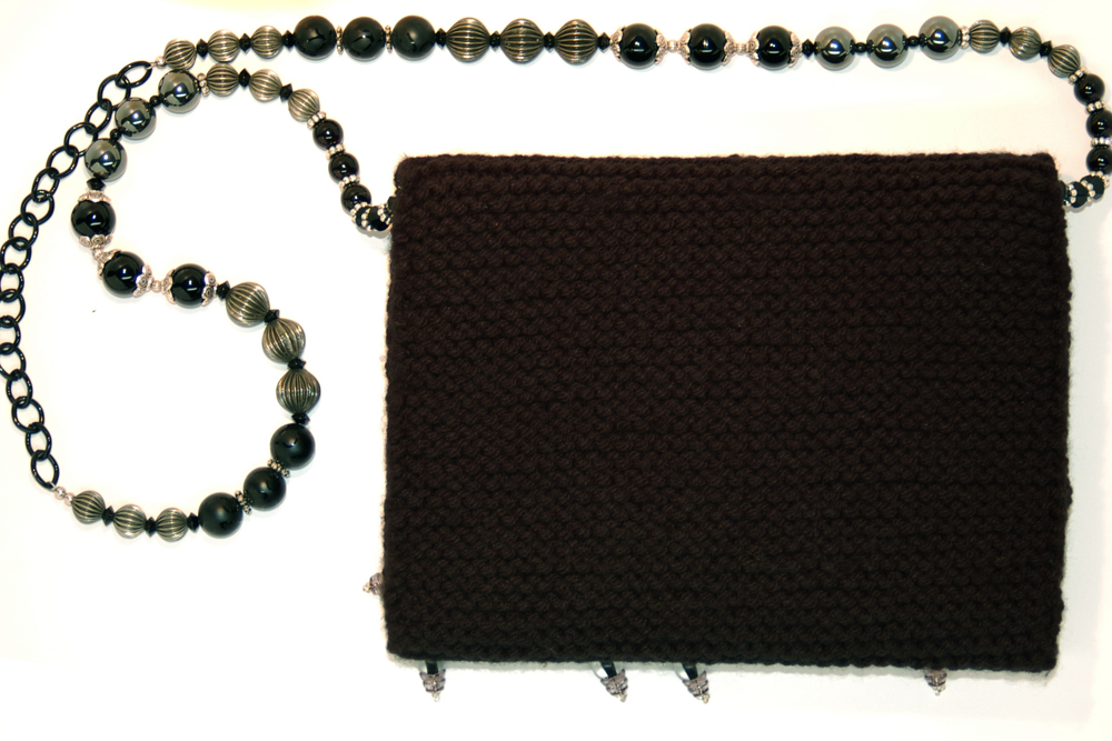 It is crafted of a soft black yarn. The embellishment on the top flap consists of four layers of soft black lace that are topped with black woven zinnia flowers with black beaded centers. Peaking out from below the lace are long hanging strands of black and translucent beads.