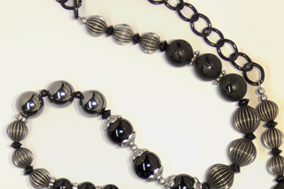 a multitude of black, silver and hematite beads. A black chain allows the purse to rest comfortably on the shoulder. In addition, the strap is removable, allowing the bag to be carried as a clutch.