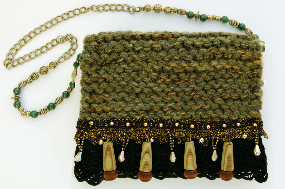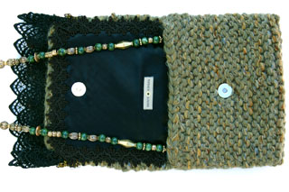Golden Jade is one of the larger bags, measuring 9"W X 8"H. It is crafted of a textured jade colored yarn. The embellishment on the top flap is trimmed with a double row of open stitched black lace that is topped with hanging olive colored fabric beads. The addition of a beaded black and gold trim brings an exciting glitter to the appearance of the purse.