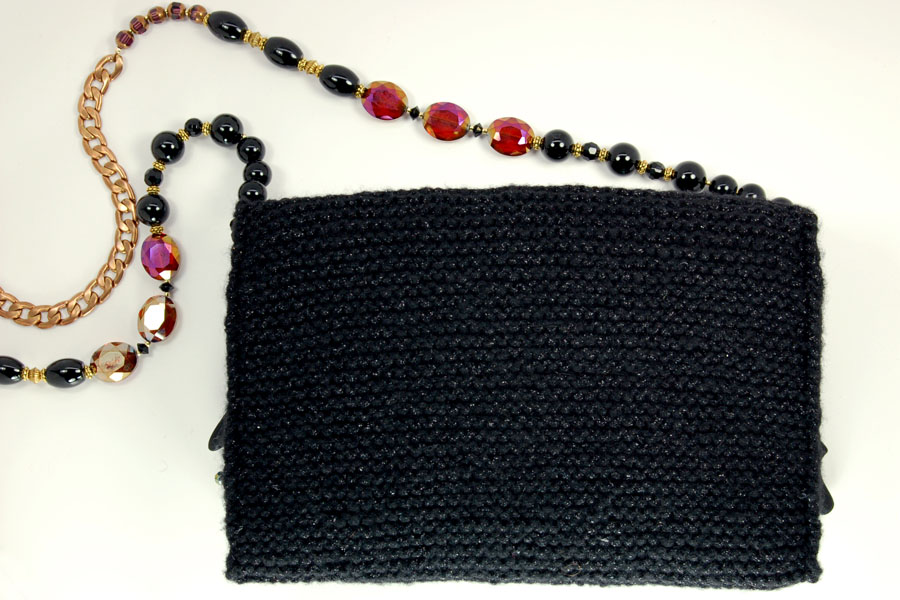 It is crafted of a soft black yarn with a hint of gold glimmer running throughout. The embellishment on the top flap is trimmed in a triple row of black satin ruffle that is topped with 8 embroidered black daisies. Below the triple row of black ruffle hang long strands of multi-colored iridescent beads.