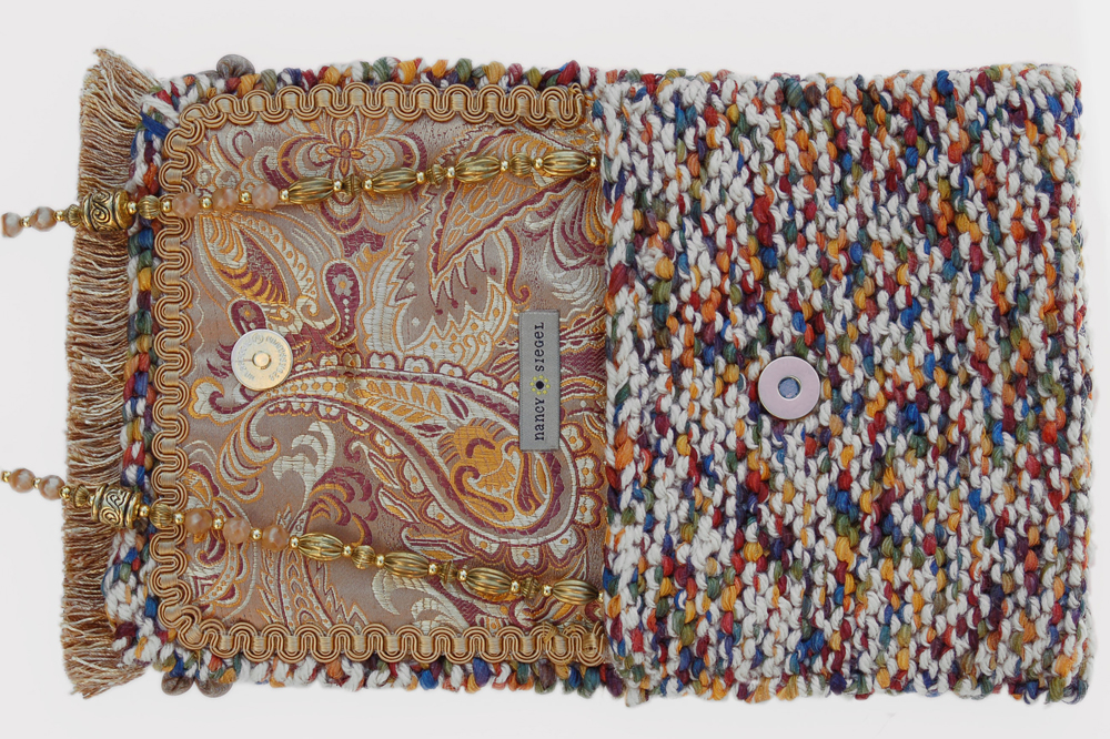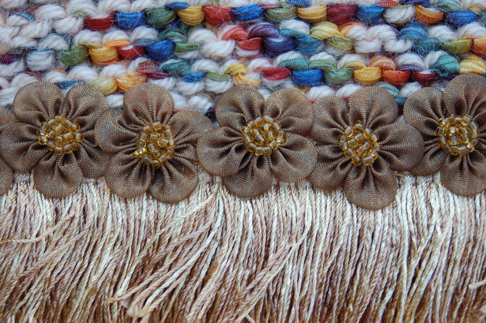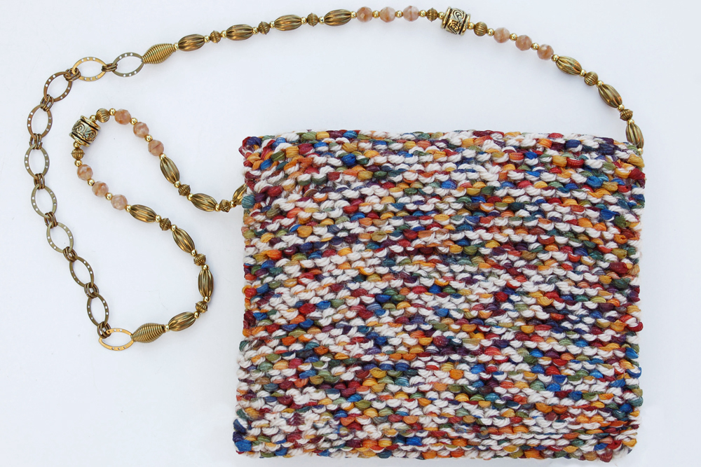 Jewel Daisy measures 7"W X 6.25"H. It is created with two yarns; a soft multi-colored jewel tone yarn in combination with a coordinating ribbon yarn. The embellishment on the top flap is trimmed with a gold fringe and topped with deep gold organza flowers that run the width of the purse.In keeping with the yellows and golds in the yarn, the interior of the bag is lined with a multi-toned gold fabric with accents of color that coordinate beautifully with the body of the purse.The strap is 32" long. It is designed with
