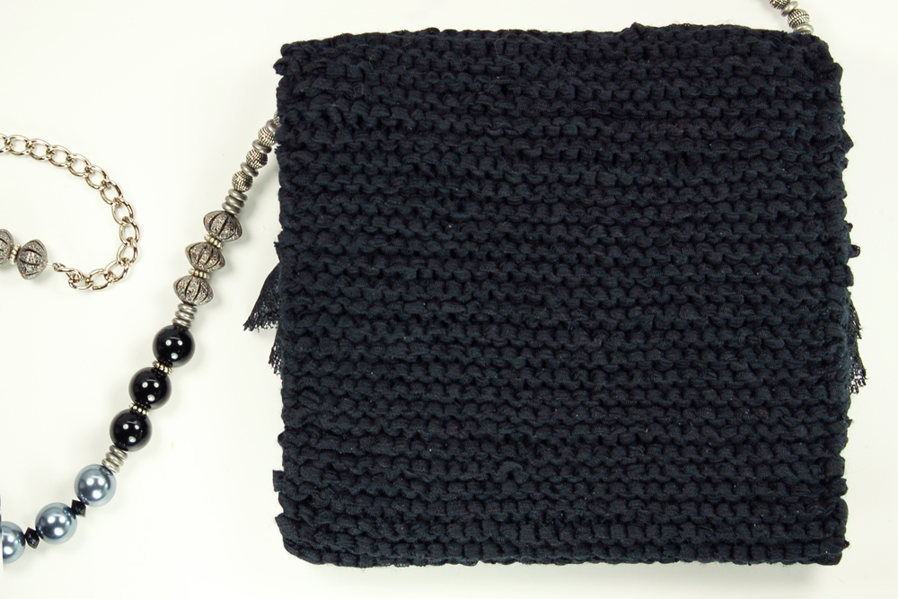 Metallic Night measures 6"W X 5.75"H. It is created with a black ribbon yarn. The embellishment on the top flap consists of a row of hanging black metallic tube beads that is topped with a beautiful black woven trim. Following is a double row of black lace ruffle. Finally, the top row consists of black sequin flowers.