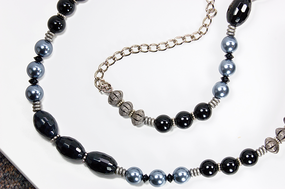a combination of black and silver beads. A black chain allows the purse to rest comfortably on the shoulder. In addition, the strap is removable, allowing the bag to be carried as a clutch. The purse has a magnetic snap closure.