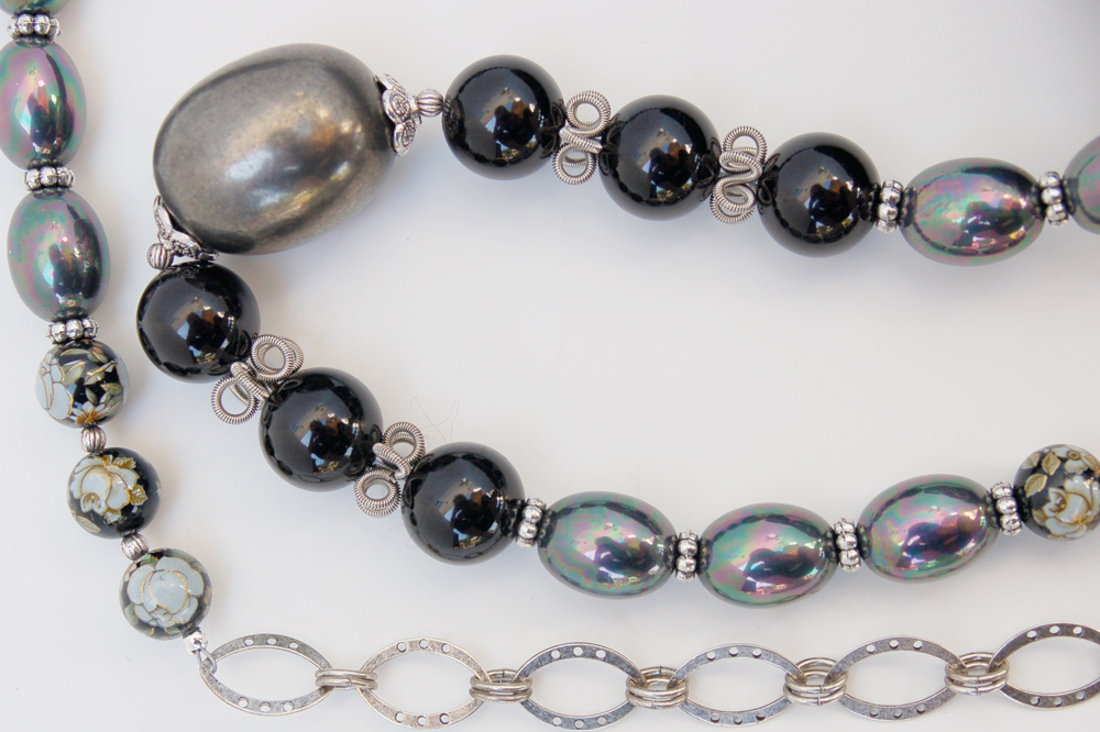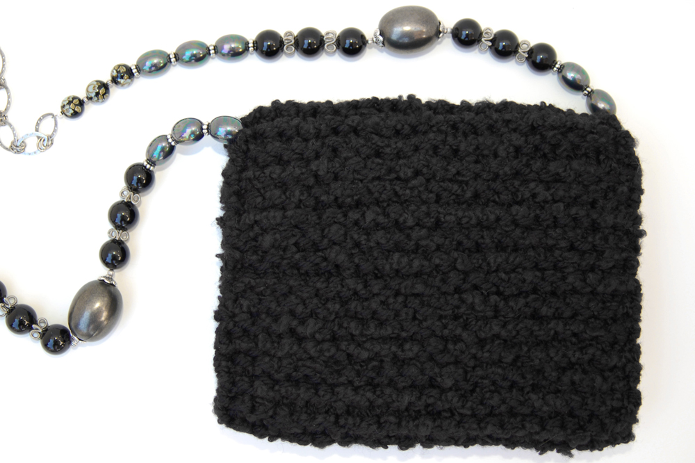 a combination of silver, black and hematite beads. A silver chain allows the purse to rest comfortably on the shoulder. In addition, the strap is removable, allowing the bag to be carried as a clutch.