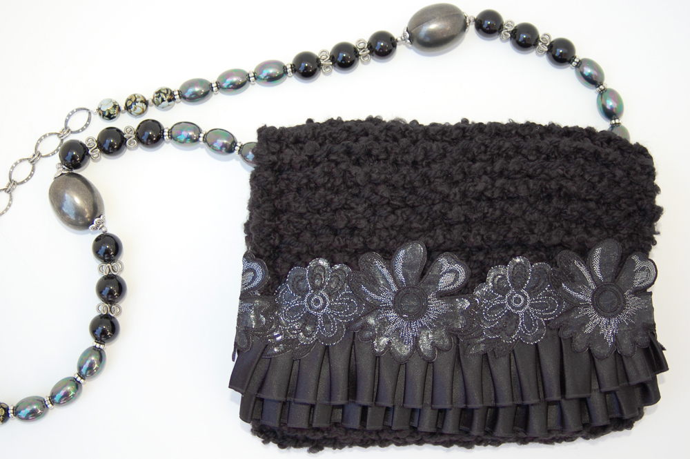 Midnight Flower measures 8"W X 7"H. It is created with a very soft nubby black yarn. The embellishment on the top flap is trimmed with a double row of black ruffle and topped with a black and silver floral applique.