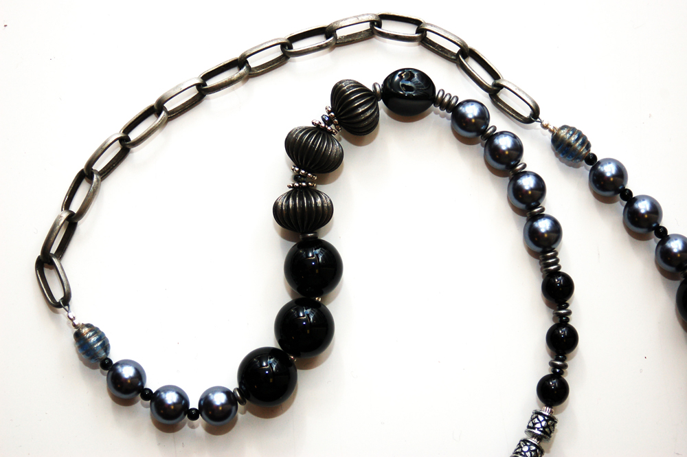 a combination of black, gunmetal and silver beads. A medium silver-colored chain allows the purse to rest comfortably on the shoulder. In addition, the strap is
