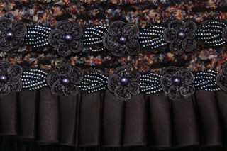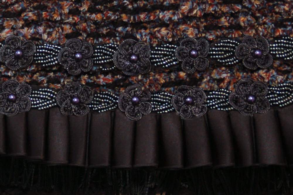 The body of the purse is constructed from a very soft black textured yarn, while the flap of the purse is a soft chenille yarn of multiple shades of blue, red and tan. The embellishment on the top flap consists of a row of black fringe, topped with a row of black satin ruffle and the finally topped with two rows of embroidered gunmetal colored flowers with patches of hematite