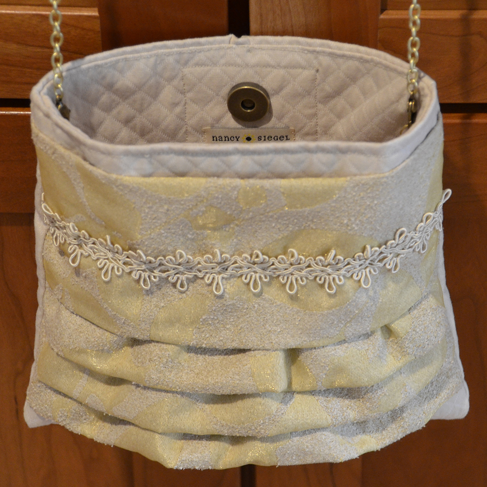 This purse is soft and feminine. The bag measures 8"W x 7 3/4"H. The body of the purse is a diamond patterned cream-colored cotton fabric and the lining is the same fabric. The front ruffle is a very pale yellow leaf pattern on a soft nubby textured fabric. There is a cream trim that spans the front width of the bag, just below the top. The bag has a 17 1/2" drop on a removable golden chain.For additional information