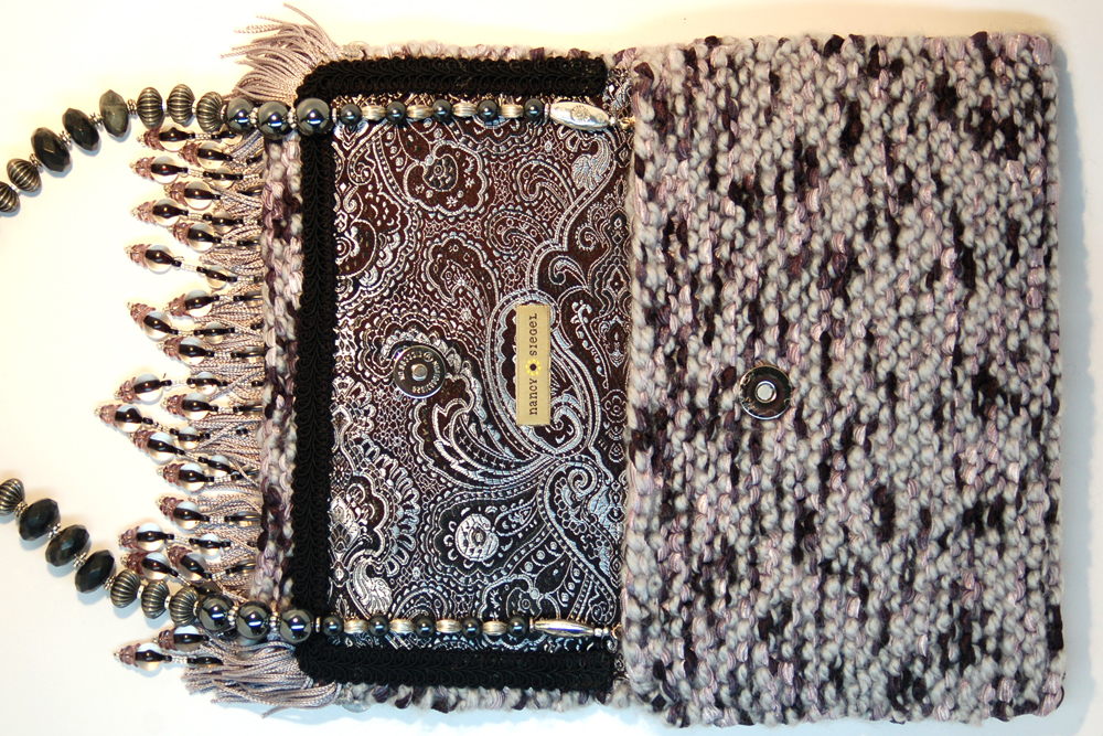 Silver Fringe measures 9"W X 6.5"H. It is created with two yarns; a very soft silvery grey colored yarn in combination with soft black and silver ribbon yarn. The embellishment on the top flap consists of a row of black and translucent hanging beads, topped with a double row of silver fringe that is bordered by ten silver organza daisies. Each daisy center is detailed with tiny translucent beads.