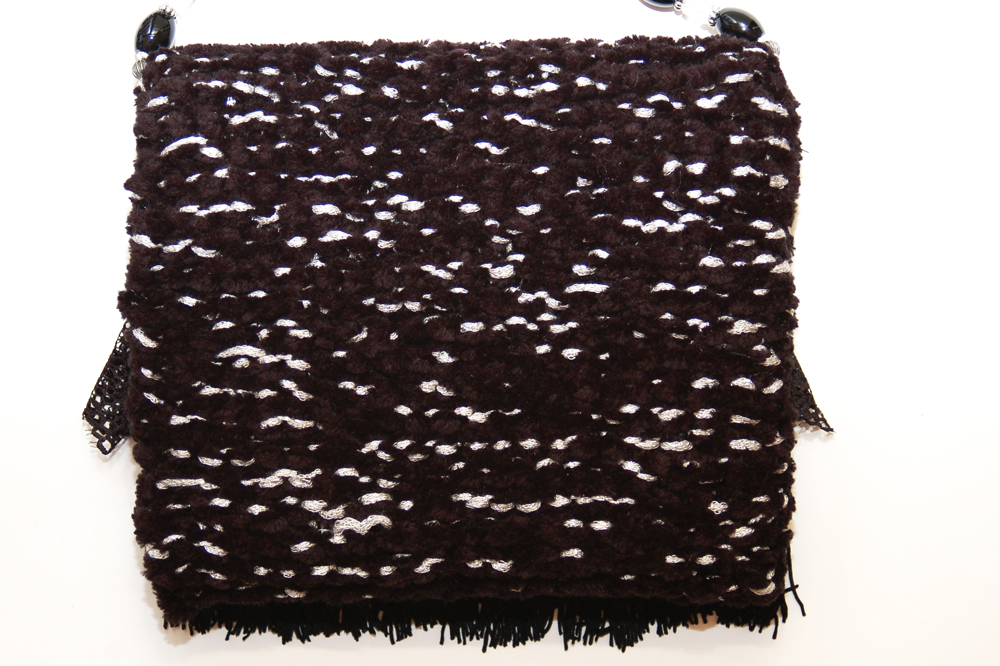 Starlight Rose measures 8"W X 8"H. It is created with two yarns; a very soft black yarn in combination with soft silver yarn. The embellishment on the top flap consists of a row of black fringe bordered by silver flowers and topped with a row of black lace that is edged with black woven zinnia flowers.The interior of the bag is lined with a silky black and silver patterned fabric that coordinates beautifully with the body of the purse.The strap is 34" long. It is designed with